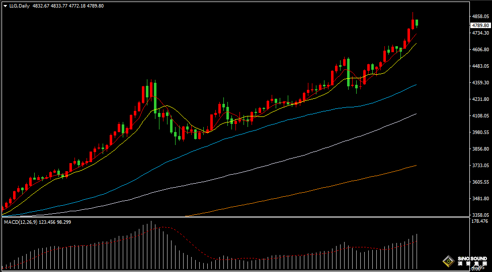 金價日線圖看,昨日金價創出歷史新高4887.76美元/盎司,昨晚金價在高位振盪回落,今日金價跌破4800美元關口,最低至4772美元附近。金價走勢符合筆者昨日文章點評策略,金價存在短期超買需要回調整理。日線指標看,5日10日均線維持多頭向上,MACD指標正動能柱相對持續,RSI指標有所回撤至73位置附近運行。