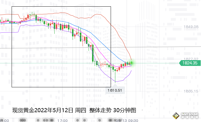 展望今日周五(5月13日):國際黃金開盤急跌觸及周圖趨勢線支撐位1811.17美元,因隔夜尾部利空壓力,而使得早間06:27一分鐘內買賣盤面瞬間成交2310手,交易合約總價值4.20億美元的大單砸盤,使得金價進一步刷新低點。但砸盤往往都是及時短線影響,故此隨后有反彈回升至1820美元上方偏觸底反彈運行。