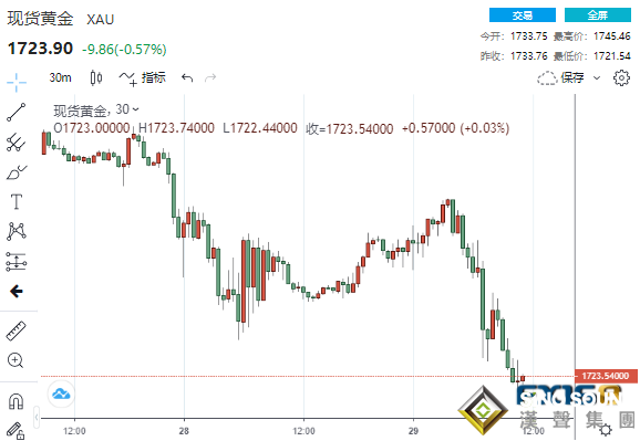 在美元強勢攀升之際,現貨黃金遭遇拋售潮突襲,最低跌至1721.44美元/盎司,創下8月11日以來新低,較日高跌去近24美元。