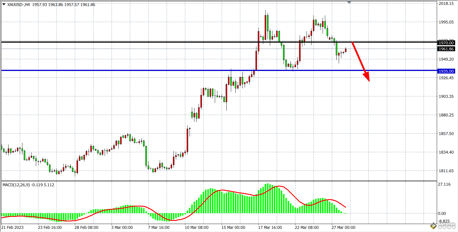 從4小時圖來看,現貨黃金進一步跌破2000美元關口。MACD在零軸上的縮量即將穿透零軸。跌勢下方,下方目標在1935-1920美元附近。