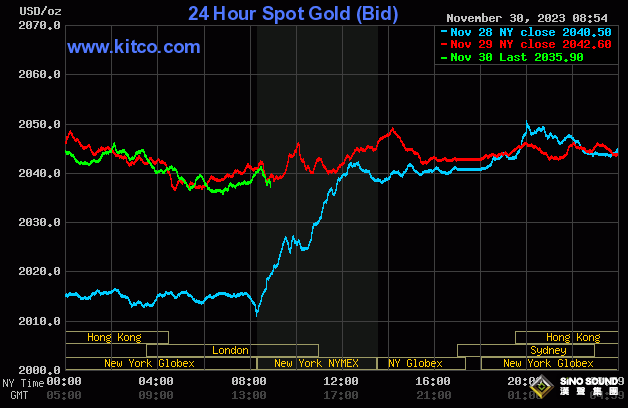 PCE數據發佈後,現貨黃金短線走低5美元,現報2037.97美元/盎司