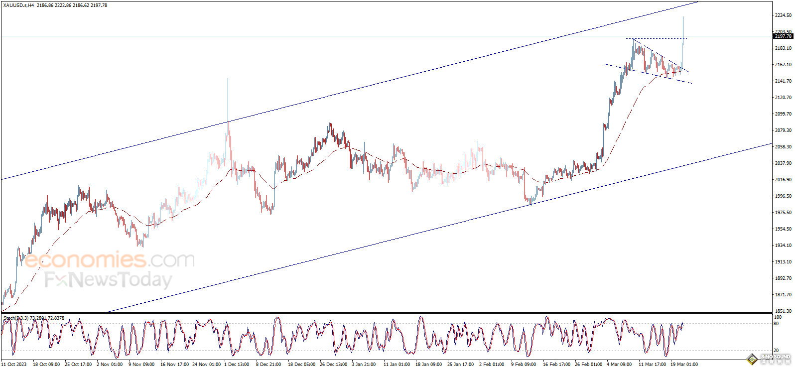 週四(3月21日)亞市尾盤,現貨黃金維持日內大漲走勢,目前金價位於2205美元/盎司附近,日內大漲近20美元。知名財經資訊網站Economies.com週三最新撰文,對日內黃金技術前景進行分析。
