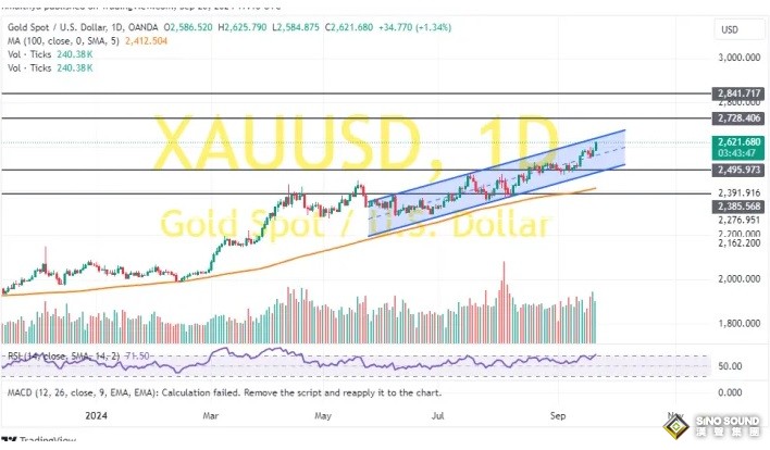現貨黃金週五收盤暴漲34.42美元,漲幅1.33%,報2620.91美元/盎司。金價週五最高觸及2625.81美元/盎司,創下歷史新高。