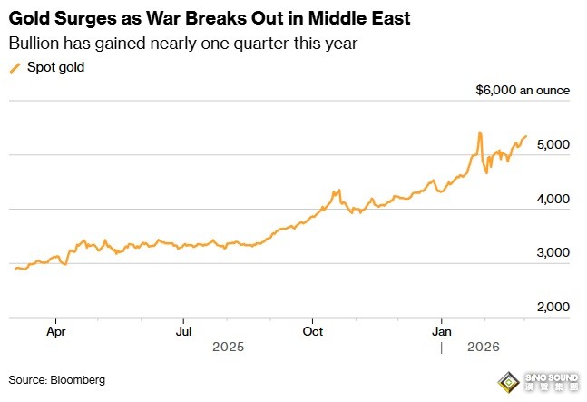 在早盤交易中,黃金上漲逾2%,至5390美元/盎司上方。此前一周,隨著美軍在該地區集結,金價已上漲逾3%。
