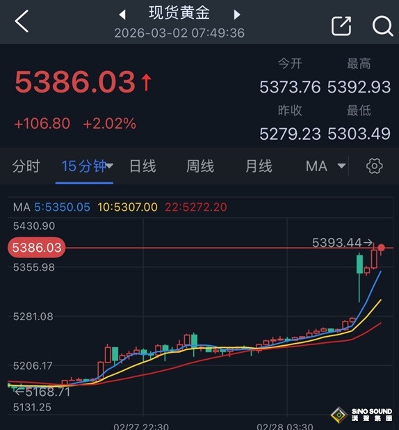 現貨黃金價格早盤最高觸及5393.44美元/盎司,日內漲幅達到114美元。