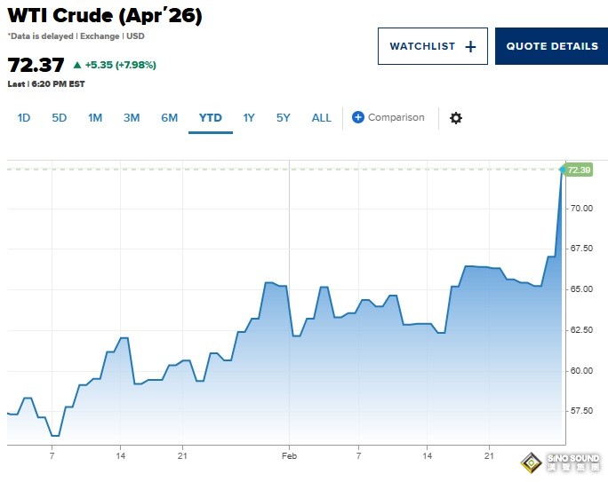 美國原油飆升逾7%,即上漲5.08美元,報72.10美元/桶。全球基準布倫特原油飆升約8%,即上漲5.91美元,至78.78美元/桶。