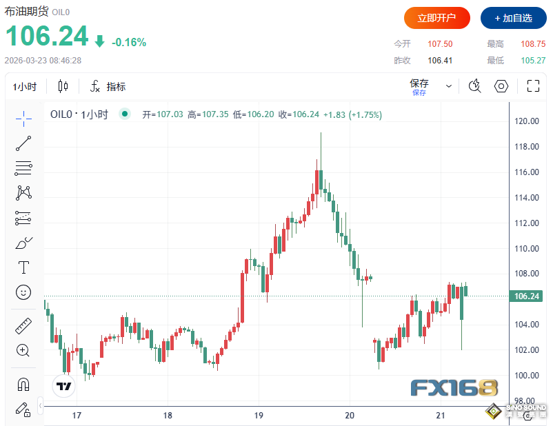 大宗商品方面,國際油價週一早盤上演明顯震盪。原油價格一度上漲1.9%,隨後迅速轉跌近1.8%,顯示市場正在激烈權衡戰爭升級風險與短線獲利了結壓力。WTI原油最新上漲0.4%,報每桶98.62美元;此前布倫特原油圍繞112美元附近波動,顯示能源市場仍處於高度敏感狀態。